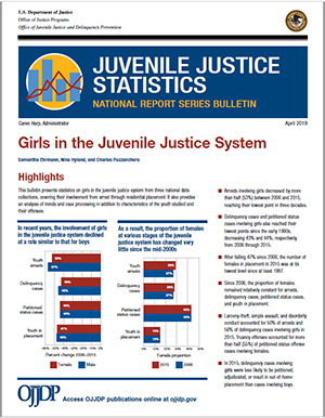 This bulletin presents a statistical portrait of girls in the juvenile justice system and is drawn from three national data collections: the FBI’s Uniform Crime Reporting Program, OJJDP’s National Juvenile Court Data Archive, and OJJDP’s Census of Juveniles in Residential Placement. From 2006 to 2015, arrests involving girls decreased more than 50 percent, from nearly 580,000 to 269,900. Moreover, the number of delinquency cases, petitioned status cases, and residential placements involving girls were at their lowest levels since the 1990s. However, girls accounted for a relatively large share of arrests for certain types of crimes, such as larceny-theft (40 percent), simple assault (37 percent), and disorderly conduct (35 percent).