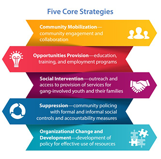 The model takes a comprehensive approach to reduce and prevent youth gang violence using five core strategies: Community Mobilization, Opportunities Provision, Social Intervention, Suppression and Organizational Change and Development. Learn how communities are implementing the Comprehensive Gang Model to make their communities safer.