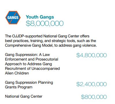 In Fiscal Year 2018, OJJDP allocated $8 million for anti-gang efforts, $5.6 million has been awarded and $2.4 million is pending award. In Fiscal Year 2019, OJJDP released applications for three gang-related funding opportunities: Supporting Victims of Gang Violence Grant Program, Youth Gang Desistance/Diversion Grant Program and the Youth Gang Suppression Implementation Grants Program. Funded projects will commence October 1, 2019.